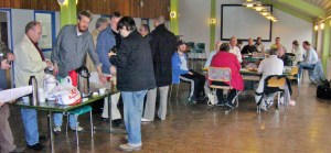 Gamla och nya kamrater droppar in på fika före Livstidsklubbens möte.