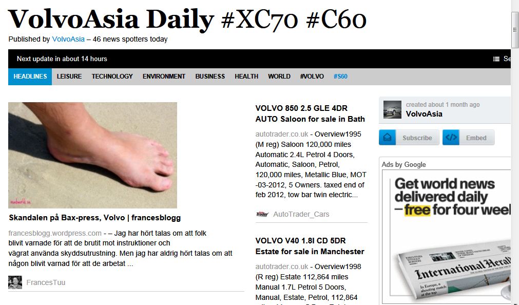 Uppdatering 2011-12-31: Via twitter hamnade den här bloggposten på nättidningen VolvoAsias förstasida igår. Nu är den redan borta därifrån, men så här såg det ut: