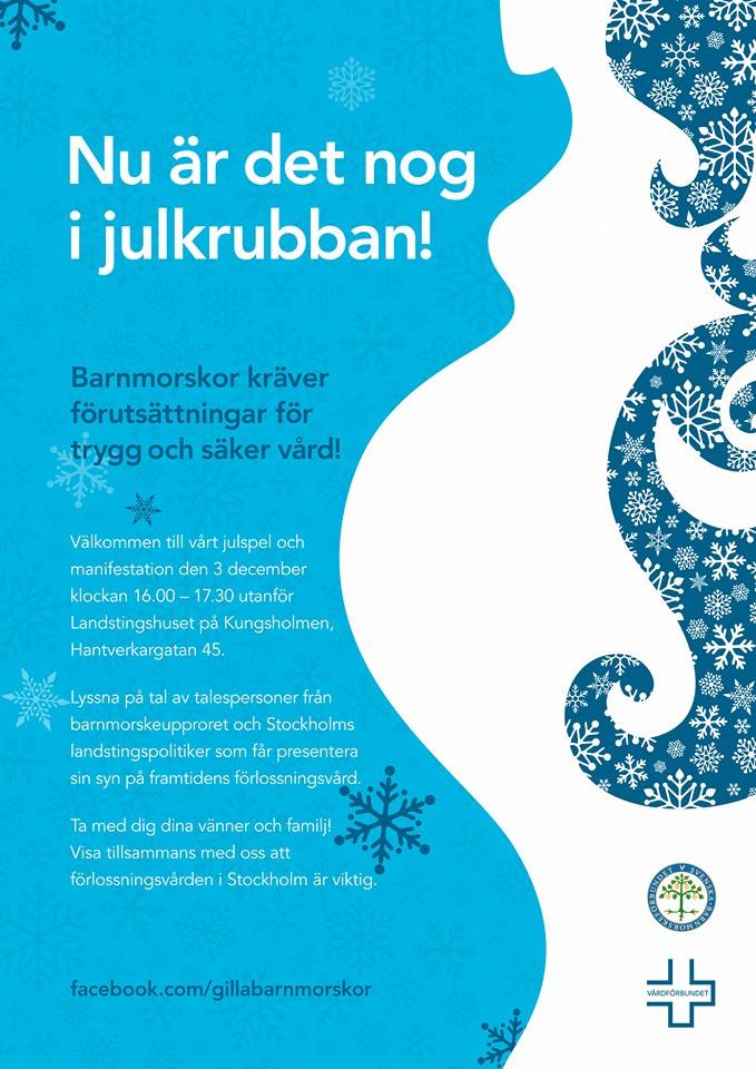 Om en vecka, tisdag den 3 december kl 16, genomför Stockholms Barnmorskor Julspel och Manifestation (facebookevent, öppnas i nytt fönster/flik) utanför landstingshuset på Hantverkargatan 45 i Stockholm, i samband med landstingsfullmäktigemöte.
