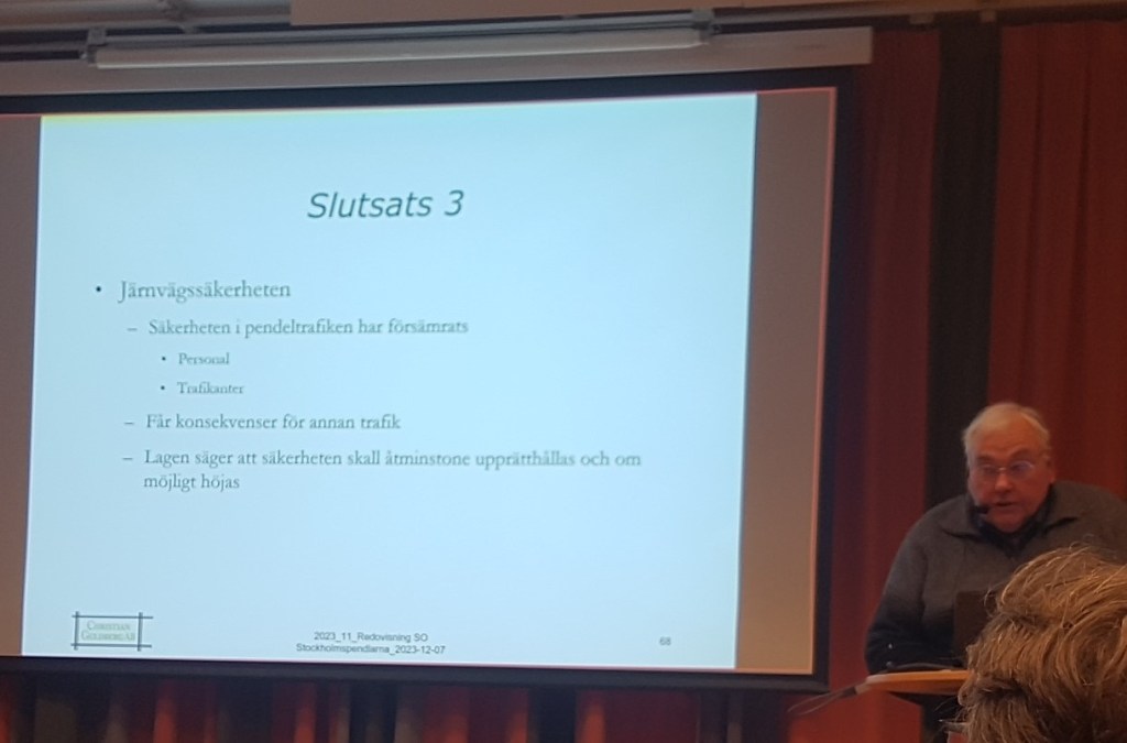 Jag kan inte upprepa allt som trafikutredaren Guldberg drog igenom i ABF-huset i förrgår. Han visade 70 powerpointbilder, som innehöll många facktermer och förkortningar. Presentationen vände sig i första hand till järnvägsfolk. Men att hans slutsatser är alarmerande (se förra inlägget, Intressant möte 7 dec 2023) fattar även en lekman. Jag hoppas verkligen att utredningen når fram till alla beslutsnivåer som varit insyltade i tågvärdsfrågan.