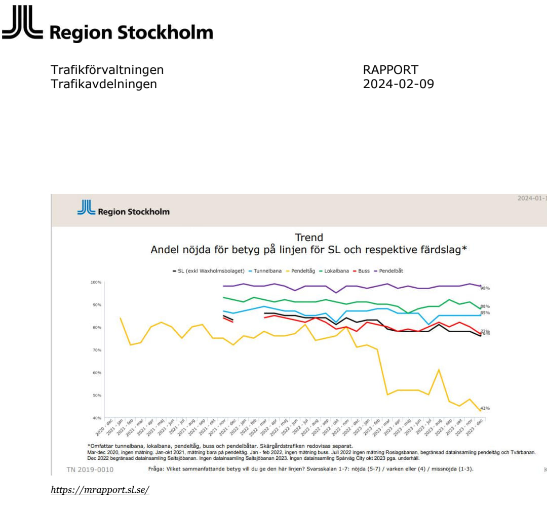 Här är Region Stockholms egen statistik över kundnöjdheten i kollektivtrafiken. Det gula strecket gäller pendeltågen. Bilden talar för sig själv om vad som hänt sedan processen att ta bort tågvärdarna från pendeltågen började sättas i verket i december 2022.