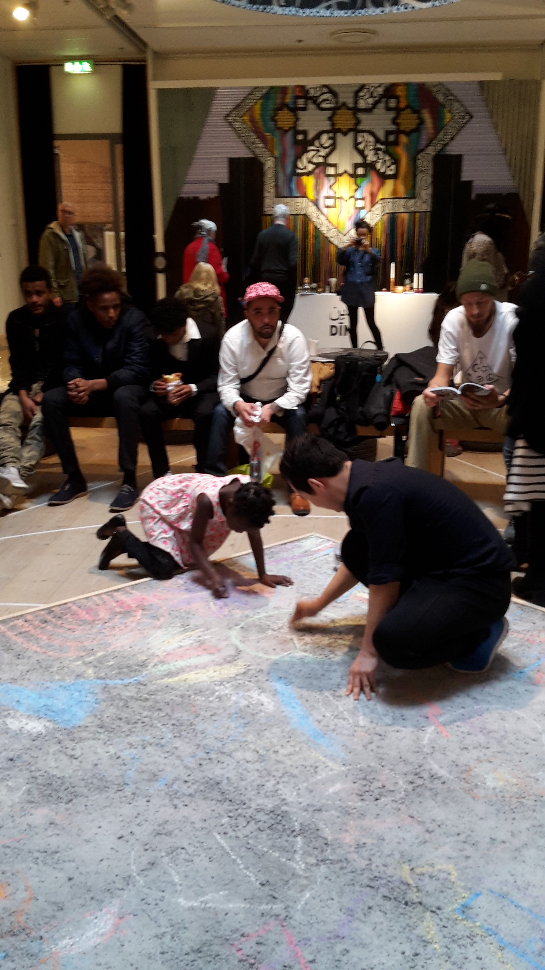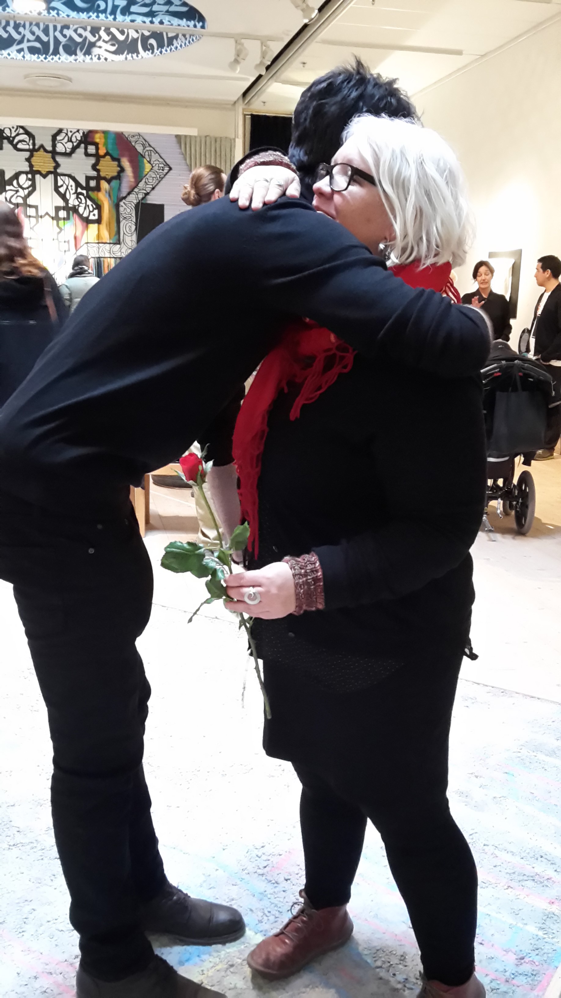 20160319_142723  En lång pojke kramar om en kort dam – Marita Castro som jobbar på boendet i Nacka. Marita berättade att det inte var något större intresse från början för att delta i konstprojektet från ungdomarnas sida. Under processens gång har de blivit mer och mer engagerade.