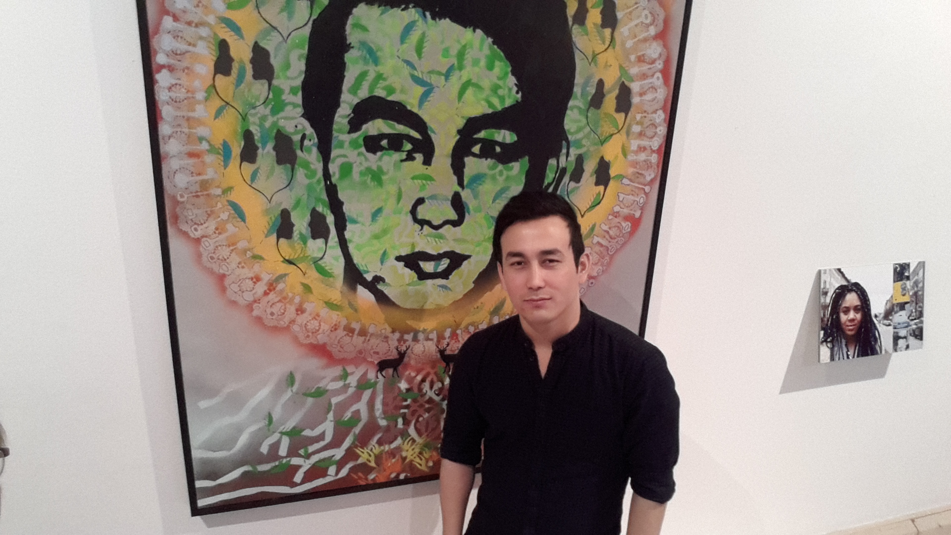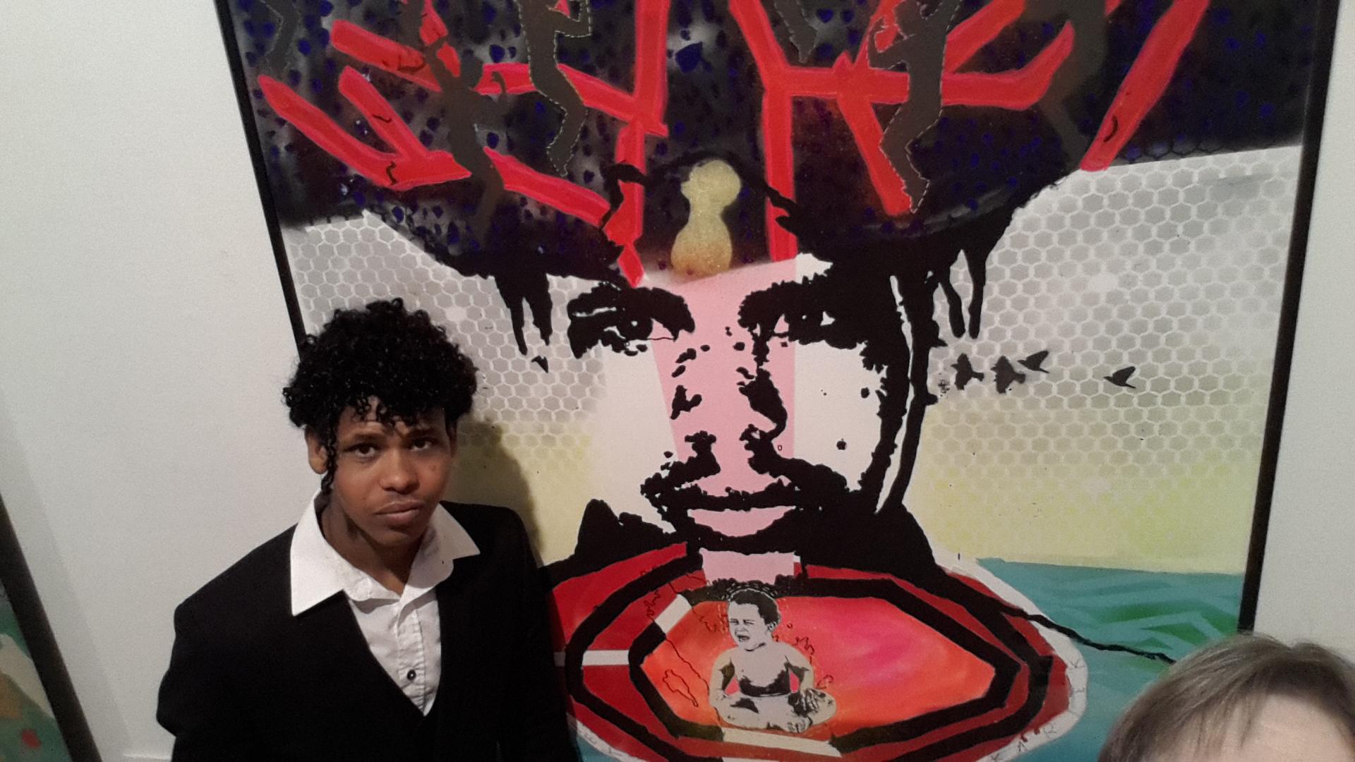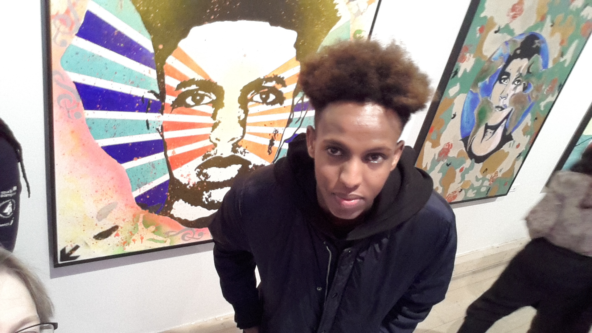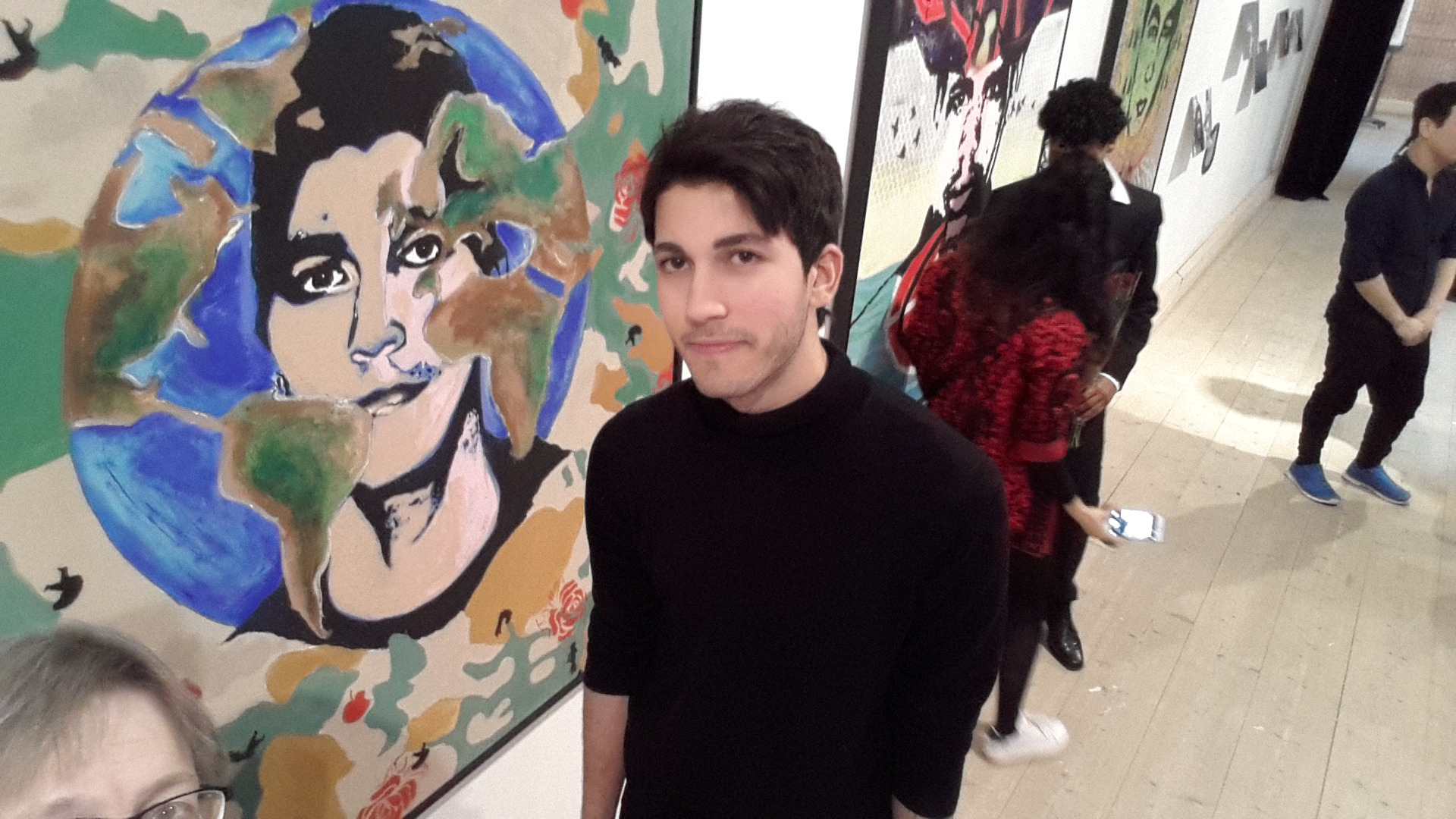 De som ställer ut sina verk är både etablerade konstnärer och ungdomar från ett boende för ensamkommande unga i Nacka. Här är de fyra unga vid sina självporträtt.